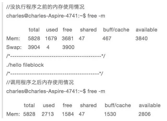 我们可以发现,buff/cache 增长了大概1G,因此我们可以得出结论,代码段和动态链接库段是映射到内核cache中,也就是说当执行共享文件映射时,文件是先被读取到 cache 中,然后再映射到用户进程空间中。