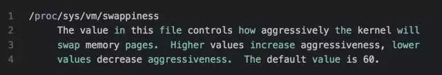 意思就是说这个值越高,越可能使用 swap 的方式回收内存,最大值为100,如果设为0,则尽可能使用回收 cache 的方式释放内存。