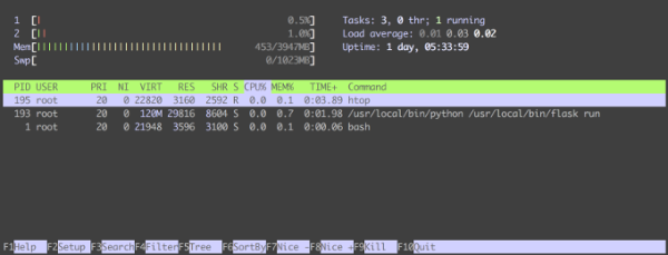 这是我们在刚才运行 top 的同一环境中 htop 的样子。显示更简洁,但功能却很丰富。