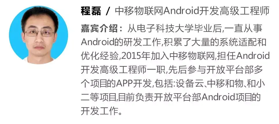 内容来源:2018 年 6 月 28 日,中移物联网 Android开发高级工程师程磊在“droidcon上海2018安卓技术大会”进行《当安卓遇到物联网》演讲分享。IT 大咖说(微信id:itdakashuo)作为独家视频合作方,经主办方和讲者审阅授权发布。