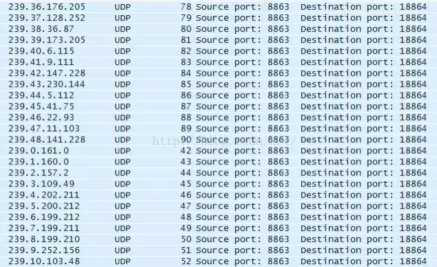 除了用长度携带数据之外还可以利用UDP组播。UDP组播的地址实际上是一个范围,向该范围中任意的IP地址发送数据都能实现组播的效果,而IP中后面的3个字节可以用来携带数据。通常的做法是用第二个字节表示UDP包的顺序,后面两个字节携带实际数据,这种方式还不用考虑路由器加密的问题。如下所示。