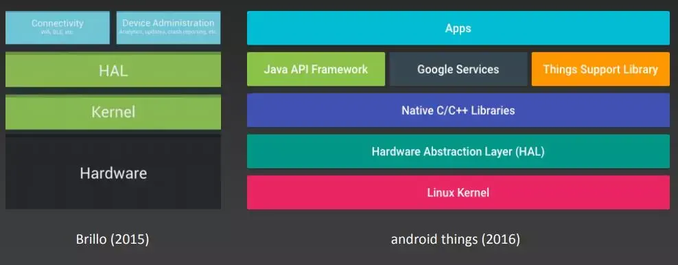 前面提到的这些其实和本次的主题关系并不是很大,接下来我们正式谈谈安卓在物联网中的应用。个人更感兴趣的是Google在2016年发布的一款物联网操作系统android things,在此之前他们还发布过一款叫Brillo的产品,不过反响不太好。Android things相比Brillo新增了Java API Framework、Google Service、应用层等,这意味着Android things支持的更多新的特性和功能。