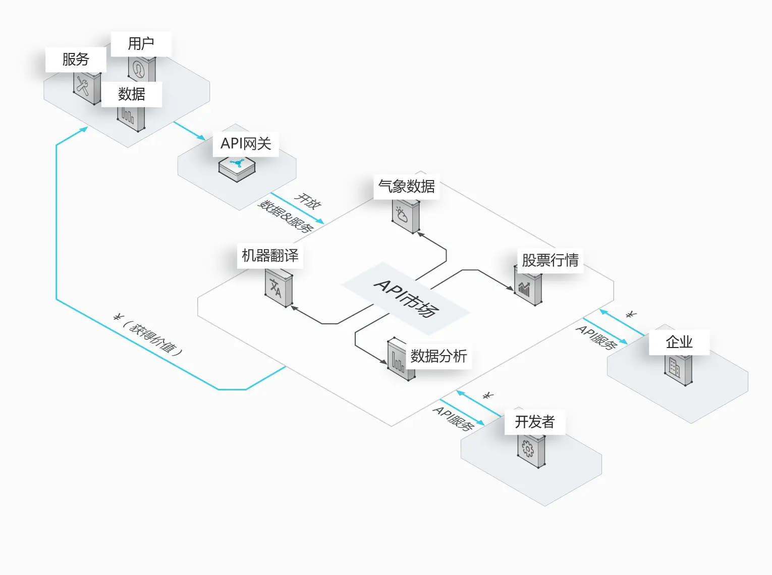 在API市场,采购第三方成熟的能力和服务, 避免平铺式开发,专注专业,借力发展。