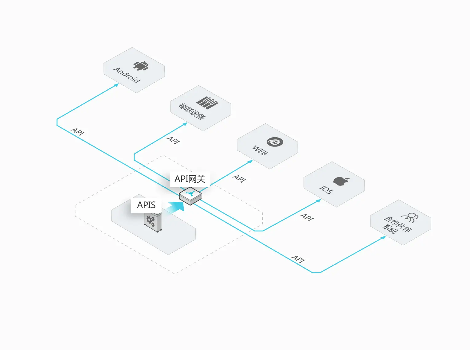 通过开放 API 与合作伙伴对接,实现深度合作, 企业间更紧密,借力发展,协同发展。