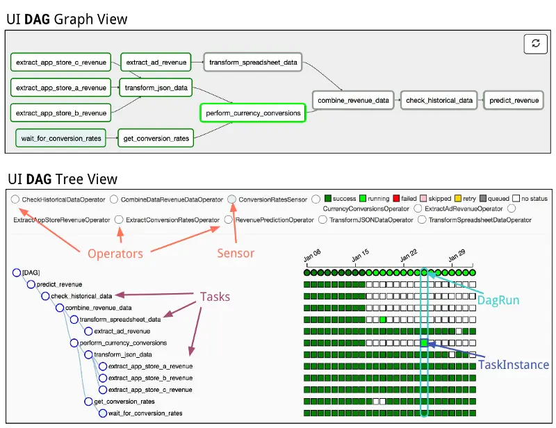 图 3.2 来自 Airflow UI 的屏幕截图,表示示例工作流 DAG。面板顶部:1 月 25 号 DagRun 的图表视图。深绿色节点表示 TaskInstance 的“成功”状态。淡绿色描绘了 TaskInstance 的“运行”状态。底部子面板:example_workflow DAG 的树图。Airflow 的主要组件在屏幕截图中高亮显示,包括 Sensor、Operator、任务、DagRuns 和 TaskInstances。DagRuns 在图视中表示为列 —— DagRun 在 1 月 25 号用青色表示。图示中的每个方框表示一个 TaskInstance —— 1 月 25 号 为 perform_currency_conversion 任务的 TaskInstance(“运行态”)用蓝色表示。