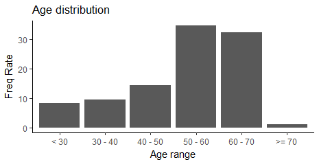 按照年龄段来计算频数,每10年为一个年龄段,统计各个年龄段的人数。由于Arthritis数据集中并没有该分类变量,这就需要自定义区间,按照分组的间隔来制作频数分布表