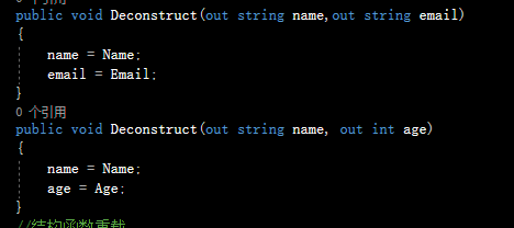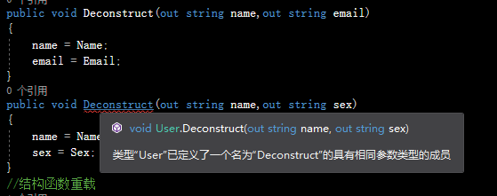 上面代码是不是很惊奇,反正我第一次看到时特别惊讶,也感觉特别有意思,那么这到底怎么实现的呢,其实只是在类中添加一个解构函数(Deconstruct)就可以,解构参数方法名称必须是Deconstruct,返回值必须是void,参数列表必须是out