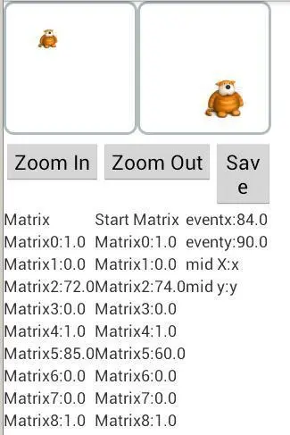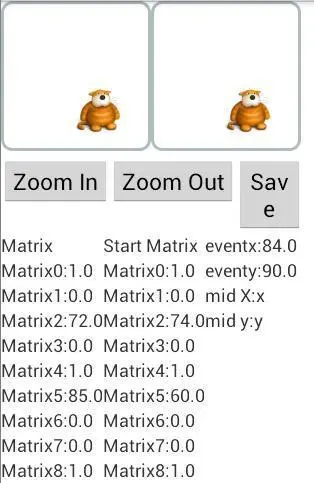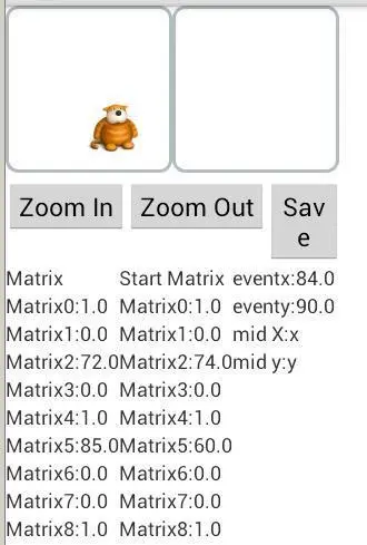 先看看效果吧。可以看到这个开发好的安卓应用有三个按钮:Zoom In缩小图片,Zoom Out放大图片和Save保存。