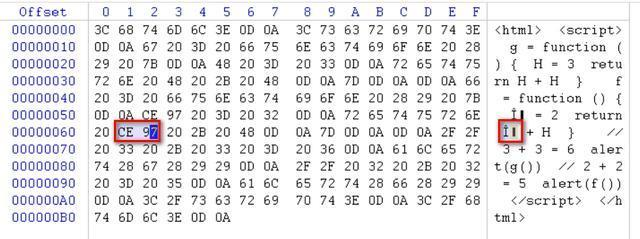 所以谜底在这里,加号前面肉眼看起来像大写字母H的变量“H",其实并不是H,其16进制编码为CE 97。它的值在函数f里赋为2,而大写H赋为3,2 + 3 = 5,所以弹出窗里我们看到的结果是5。