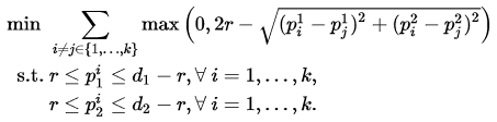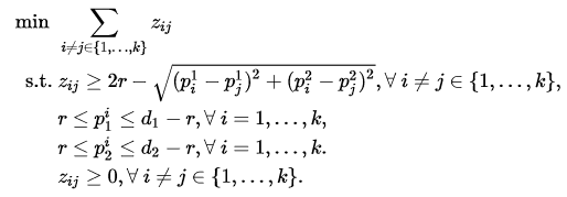 定义变量 为圆心的x和y坐标. 那么决策问题可以用如下非凸非线性规划问题来求解, 也见:Birgin, Ernesto G., J. M. Martınez, and Débora P. Ronconi. "Optimizing the packing of cylinders into a rectangular container: a nonlinear approach." European Journal of Operational Research 160.1 (2005):
