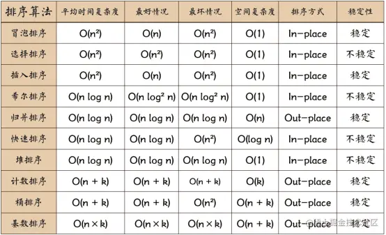 排序算法可以分为内部排序和外部排序,内部排序是数据记录在内存中进行排序,而外部排序是指在排序期间全部对象太多,不能同时存放在内存中,必须根据排序过程的要求,不断在内,外存间移动的排序。常见的内部排序算法有:插入排序、希尔排序、选择排序、冒泡排序、归并排序、快速排序、堆排序、基数排序等。用一张图概括: