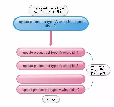记录每一条修改数据的SQL语句(批量修改时,记录的不是单条SQL语句,而是批量修改的SQL语句事件)。看上面的图解可以很好的理解row level和statement level两种模式的区别。
