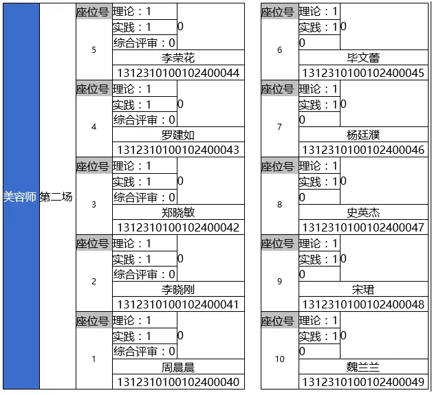 首先,我们就拿我们每个人几乎都遇到过的大大小小的各种考试来举例。每逢考试就一定会有考场座位分布图,以便考生对号入座参加考试。这里看一个具体的案例,来自于某地的一次职业技能考试,总共涉及数十所所学校,数千名考生,每人参加4门学科,需要按照专业、场次、时间以及一定的随机规则进行座次安排,最终输出座位分布图,然后打印并在各个考场张贴。要求每名考生的座位标签如下图所示: