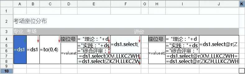 B4 单元格中表达式为:=ds1.group(KCMC;KCMC:1),操作同上,KCMC代表考场名称