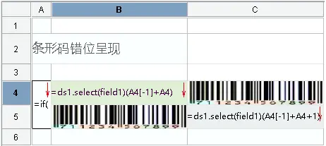 B4 单元格中表达式为:=ds1.select(field1)(A4[-1]+A4),意从结果集ds1.select(field1)中根据行号取出条形码