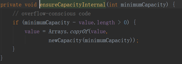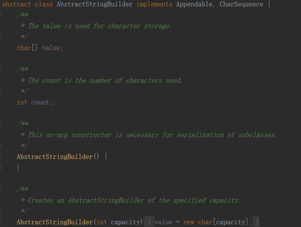 但注意 AbstractStringBuilder 的 char[] value 并没有用 final 修饰,那就意味着这个是可变的字符数组。那这个数组是被初始化大小的,我们如何实现可以拼接很多字符串呢?StringBuilder 不是可以无限追加( append )字符串吗?