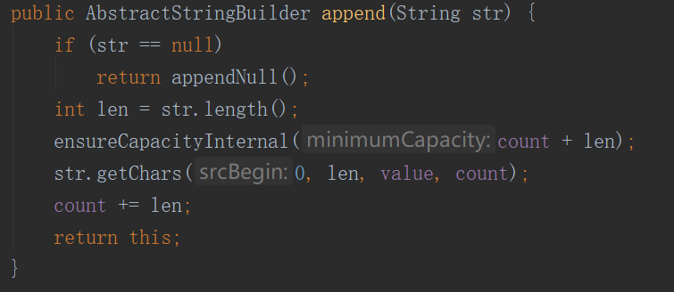 把 str 的内容追加到 AbstractStringBuilder 的 char[] value 中,通过数组的复制实现。(其实还是通过 System.arraycopy 这个方法实现)