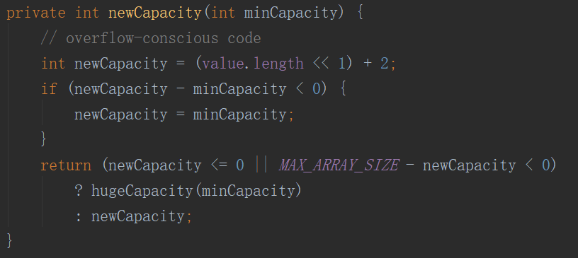 可以看出新数组的大小一般为原数组大小的 2 倍 + 2,如果原数组大小的 2 倍 + 2 都小于 minimumCapacity,那么新数组的大小为 minimumCapacity。