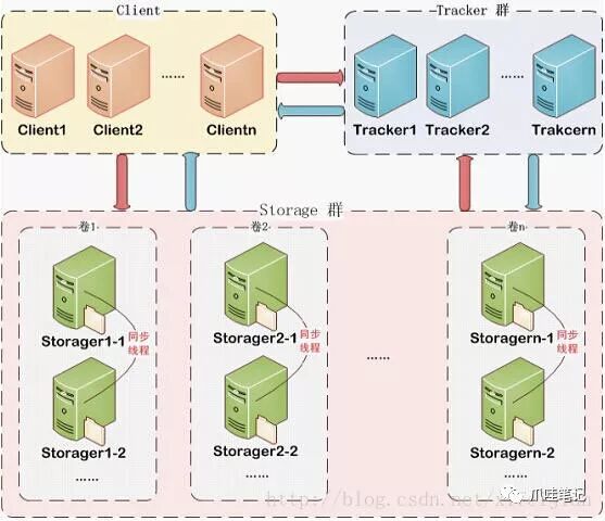 为了支持大容量,存储节点(服务器)采用了分卷(或分组)的组织方式。存储系统由一个或多个卷组成,卷与卷之间的文件是相互独立的,所有卷的文件容量累加就是整个存储系统中的文件容量。一个卷可以由一台或多台存储服务器组成,一个卷下的存储服务器中的文件都是相同的,卷中的多台存储服务器起到了冗余备份和负载均衡的作用。
