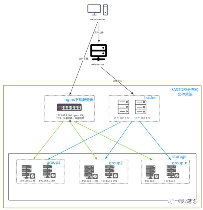FastDFS架构包括Tracker server和Storage server。客户端请求Tracker server进行文件上传、下载,通过Tracker server调度最终由Storage server完成文件上传和下载。