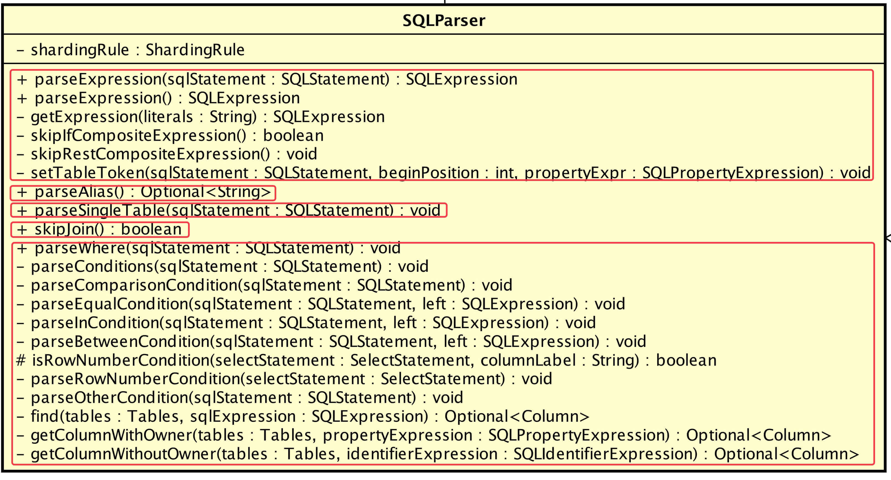 这个类其它方法很重要,逻辑相对简单,我们就不占用篇幅了。大家一定要看哟,后面调用非常非常多。AbstractParser.java 传送门。👼也可以关注我的公众号( 芋道源码)发送关键字【sjdbc】获取增加方法内注释的项目地址。