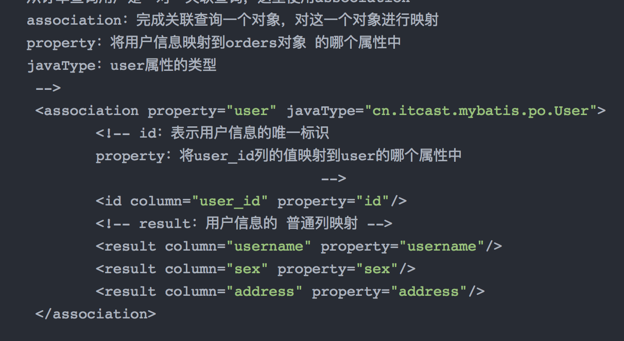 应用场景:如order中有字段orderdetail,是一对一关系,映射到association中的column即orderdetail中有的字段