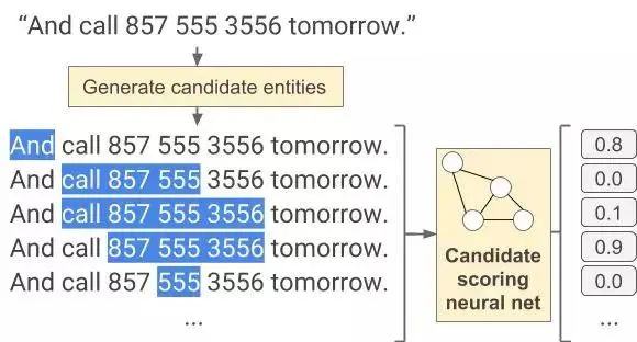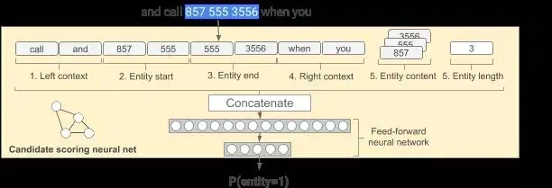 我们想要很容易地训练网络,但是并没有明显的数据集来完成这项任务,因此我们提出了一种训练算法,可以从实际部分生成合成示例。 具体地说,我们从 Web(使用 Schema.org 注释)收集了地址,电话号码和命名实体(如产品,地点和公司名称)和其他随机单词的列表,并使用它们来合成神经网络的训练数据。 我们按原样获取实体对象并围绕它们生成随机文本上下文(来自 Web 上的随机单词列表)。 此外,我们在电话号码的负面培训数据中添加 “确认号码:” 或 “ ID:” 等短语,以教会网络在这些情况下禁止电话号码匹配。