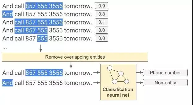 从分类网络的正面示例中创建人为的负面示例。 例如,对于正面示例:“今天给我打电话 857 555-3556”,标签为 “电话”,我们生成 “今天给我打电话 857 555-3556” 作为带有 “其他” 标签的反面示例。 这教导分类网络更精确地面对实体跨度。 如果不这样做,不管跨度如何,网络将只是一个检测器,用来检测输入中的某个地方是否有电话号码,仅此而已。
