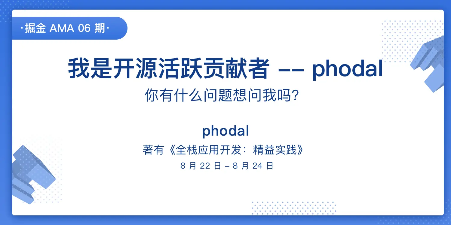 掘金 AMA 第六期嘉宾是 开源活跃贡献者 + 程序员秀恩爱伪专家 -- phodal,划重点:程序员秀恩爱。