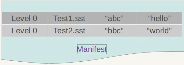 图中只显示了两个文件(Manifest 会记载所有 SSTable 文件的这些信息),即 Level0 的 Test1.sst 和 Test2.sst 文件,同时记载了这些文件各自对应的 key 范围,比如 Test1.sstt 的 key 范围是“an”到 “banana”,而文件 Test2.sst 的 key 范围是“baby”到“samecity”,可以看出两者的 key 范围是有重叠的。