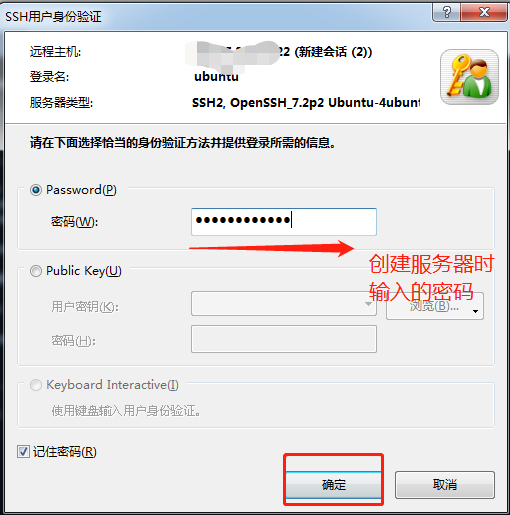 用户名统一填:ubuntu,点击“确认”,输入云服务器密码点击“确认”
