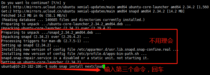 4、输入第三个命令 sudo snap install nextcloud ,回车开始下载 NextCloud 安装包。