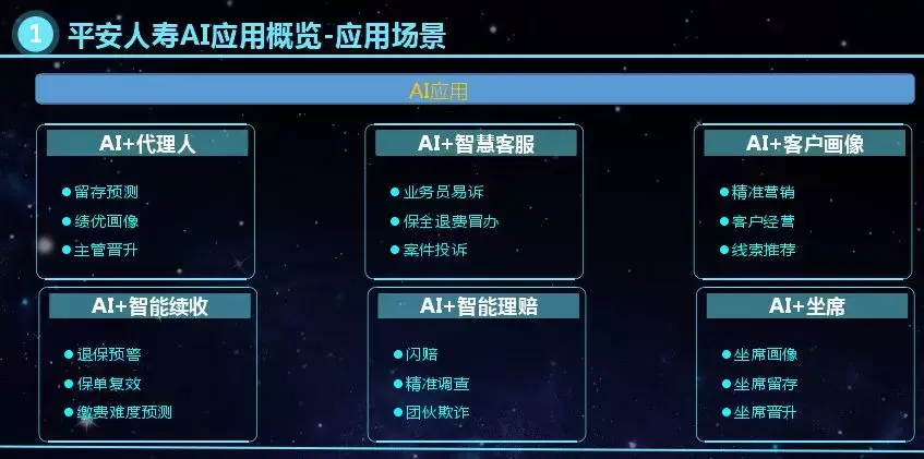 接下来讲下我们用AI技术干嘛,AI在金融领域用的还是很广,很多业务都是靠数据推动,金融对数据依赖性很强。具体应用有代理人管理,平安有百万级的代理人,利用AI算法管理代理人的招聘、销售、升级,还有智慧客服、智慧续收、智慧理赔、坐席等应用于很多场景。