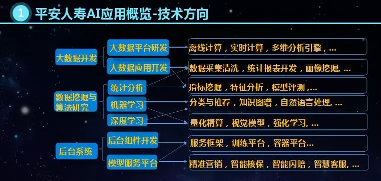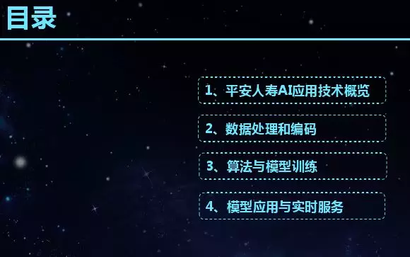 今天主要从以下几个方面进行分享:平安人寿AI应用技术概览,数据处理和编码,模型应用与实时服务,算法与模型训练。