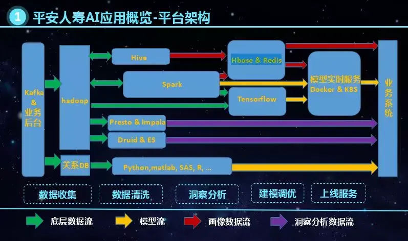 上图是我们的平台架构,首先是数据搜集,主要依靠Kafka,对于老系统自有一套收集机制,数据搜集完成进入Hadoop和关系DB。数据清洗主要依靠hive和spark,hive实现hql,spark进行复杂的数据处理。除此之外还要做一些洞察分析,分为两块一个是单表快速实时分析,第二个是多表关联实时分析。单表主要用Druid & ES做多维,多表关联主要靠Presto & Impala。还有一些用matlab, SAS做精算量化模型,还用Tensorflow做深度学习,用Hbase,Redis主要做画像存储,提供实时查询,还有一些容器平台对外提供容器调用。