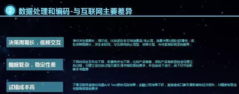 数据是核心,接下来讲一下我们的数据以及数据处理情况。保险行业做数据挖掘遇到的挑战很多,第一个挑战就是决策周期长,低频交互,比如保险非日常消费品/非必需,消费决策过程比较理性。因此模型有没有效都要经过很长的周期检验,在这个周期内都将面临很大的风险。再一个数据比较复杂,稳定性差。数据复杂体现在首先业务线很多,每个业务线存储介质也有很多,每个数据产生的场景也不同,数据种类差异也很大,有文本、LBS,还有一些图像的、自然语言的。还有一个成本比较高,互联网所做的模型都要经过A/B text,但是保险行业不能这样执行。