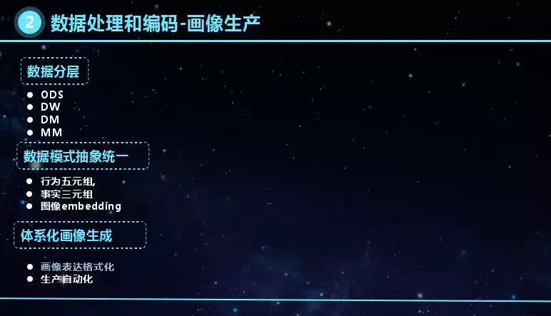 建立画像生产首先建立数据分层(ODS、DW、DM、MM),这种数据分层主要是偏业务,虽然没有技术难点但是将其建好不容易。然后做数据模式抽象统一,针对行为数据、事实数据和图像三类数据进行抽象统一。每天产生的行为数据很多,如保险打电话、理赔、网上点击按钮等,归类行为五要素,即什么人在什么时间对什么对象做了什么动作以及这个动作的强度。事实三元组即主语、谓语、宾语,对图像就做embedding。将数据抽象统一后做画像,画像有很多种做法,第一种就是作坊式生产,依据领导要求生存画像,这样比较累。目前标准是画像需求格式要标准化,从而实现自动化的生产机制,这样做的好处就是首先节省人力,需求可以重复利用。