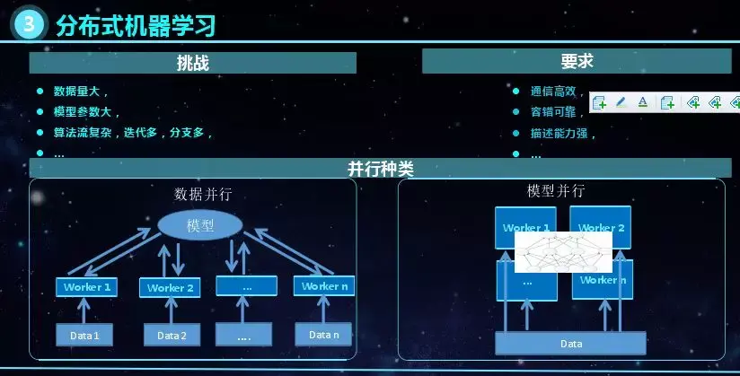 接下讲一下如何进行算法和模型的训练,目前主要的还是基于分布式或者并行机器学习。在面对数据量大,模型复杂、参数大,并行运行平台能解决这个问题,平台要求通信高效、容错可靠、描述能力强,一个机器不能运行所有算法的原因就是其无法描述这个算法,因此需要一个描述能力强的平台。目前并行的种类有模型并行、数据并行,还有混合并行。目前用的比较多的是数据并行,将数据先切分,分配到每个worker计算,得出一个梯度传入模型,模型将其汇聚,返回一个worker,然后利用worker进行本地模型的更新。