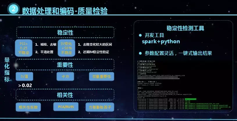 接下来讲一下数据质量如何检验,质量检验一直是个难点,其指标很复杂,时间很差,很难判断计算是否准确。主要从三个方面入手,首先稳定性,给出的模型虽然很难判断其稳定性但是需要知道其不稳定性多大。第二个观察其重要性,有些指标现实中很重要但是模型中表现不重要,这种建模出问题,因此需要判断变量在模型中的重要性,评价指标有IV值、卡方、变量重要性(线性模型中的权重、算法中出现的频率)。接着需要剔除相关变量,检验相关性的指标有相关性系数、PCA/RUFS、方差膨胀因子,除此之外还会降维(PCA不够稳定,因此用了RUFS算法)。为检验稳定性开发工具spark+python,实现数配置灵活,一键式输出结果。