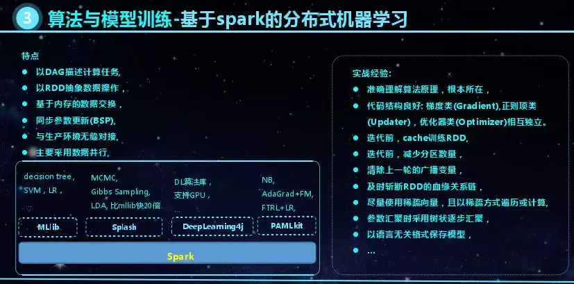 接下来分享一下我们是如何实现的。首先分布式机器学习集群依靠spark,spark特点有:以DAG描述计算任务,以RDD抽象数据操作,基于内存的数据交换,同步参数更新(BSP),与生产环境无缝对接,主要采用数据并行。基于spark分布式集群开发了很多包,MLlib包实现决策树、SVN、LR;splash实现了MCMC,Gibbs Sampling,LDA, 比mllib快20倍;还有一个是Deep Learning4j,主要是在spark上做深度学习,支持GPU,但没有TensorFlow灵活不能自动写网络结构;接下来就是我们实现的PAMLkit,支持NB,Ada Grad+FM,FTRL+LR算法。