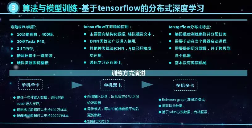 接下来讲一下在TensorFlow下如何做深度学习。TensorFlow应用主要是面向结构化数据,辅以视觉文本,DNN算法应用广泛,其他相关算法(CNN、AE)已开始成功应用,强化学习正在研发中。TensorFlow分布式特点:编码组建训练集群并分配任务; 需要手动在各个机器启动进程;需要提前切分数据,并手拷贝到各个机器;基本没有容错机制。训练方式经过了以下三个阶段:单机单卡,整体一次性读入数据,迭代时逐batch送入显存;后来进入单机双卡,采用输入队列,出队后在GPU之间轮发数据。同步模式,每GPU的梯度做平均后更新参数;后来进入多机多卡,采用Between graph,准同步模式。提前切分数据,不用手动启动进程,主要是基于pdsh分发数据,启动服务。