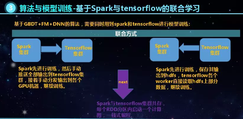 很多时候是基于spark和TensorFlow联合建模,spark主要依靠其并行能力,TensorFlow建立复杂模型。怎样将两者结合起来,例如GBDT+FM+DNN模型,GBDT+FM在spark上训练,DNN在TensorFlow上。第一个阶段是将spark的输出直接拷贝到TensorFlow上,TensorFlow上切分数据然后拷贝到各个机器上去。目前是将spark训练输出的数据放到HDFS,然后利用PDSH启动TensorFlow上各个worker进程,直接读取hdfs上部分数据,继续训练。目前正在研发Spark与tensorflow集群共存,每个RDD分区内启动一个计算图,一栈式编程。