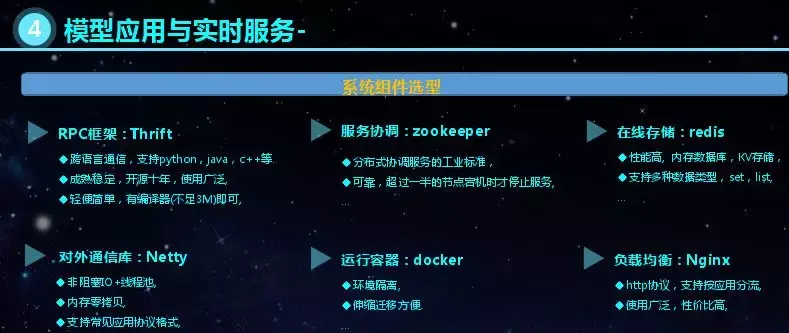为了实现目标借助了很多开源组件开发。框架采用thrift,特点是:跨语言通信,支持python,java,c++等;u成熟稳定,开源十年,使用广泛;轻便简单,有编译器(不足3M)即可。服务协调用zookeeper,在线存储用redis,对外通信库用Netty,运行容器用docker,负载均衡用Nginx等。