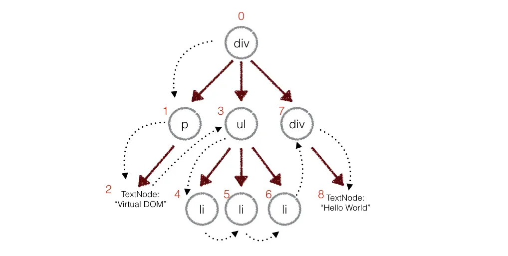 在实际代码中,会对新旧两棵树进行一个深度优先的遍历,这样每个节点都会有一个唯一的标记,然后记录差异