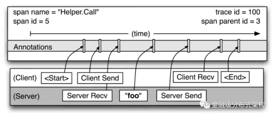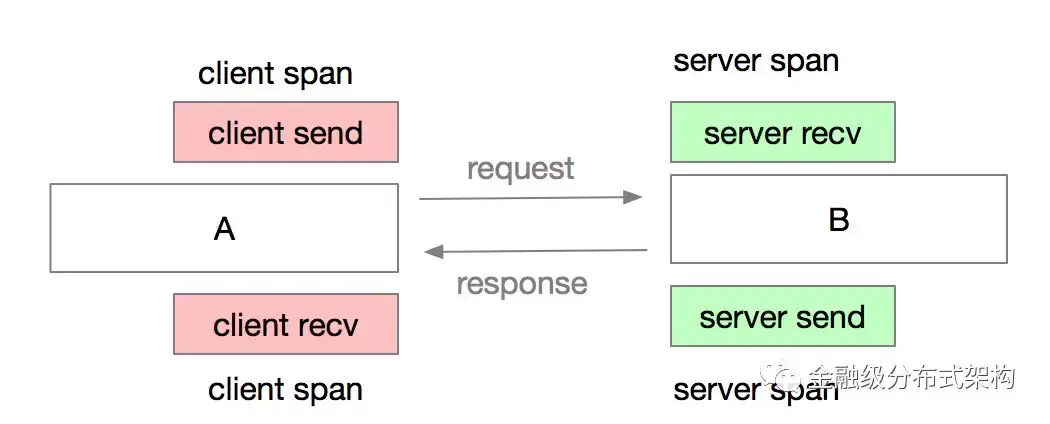 Dapper 将一个调用过程构建成一棵调用树(称为 Tracer ),Tracer 树中的每个节点表示链路调用中的一个模块或系统。 通过一个全局唯一的 traceId 来标识一个请求调用链。 并定义了span,span表示一个系统的调用,一个 span 包含以下阶段: