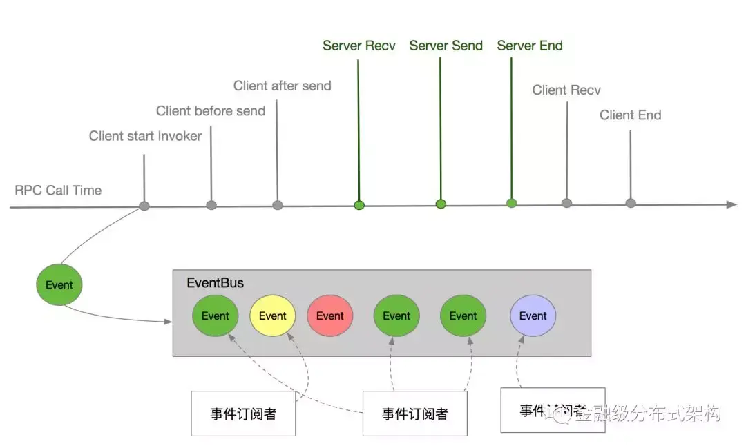 这里会订阅 9 种事件, 通过监听 SOFARPC 的这 9 种事件,来完成埋点数据的获取和异步磁盘写入操作。SOFARPC 通过事件总线设计来订阅这些事件,当事件发生时通知对应的订阅者做相应的操作。