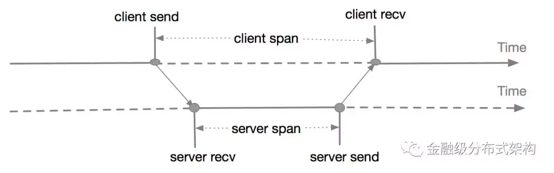 如上图所示展示了两个系统调用中的 client span 和 server span 的关系, 一次 RPC 调用称为 span, 并产生一个 spanId, client span 的 spanId 和 server span的 spanId 是同一个,因为都在一个 RPC 调用中。 下图展示从时间的维度来解释这两者的关系: