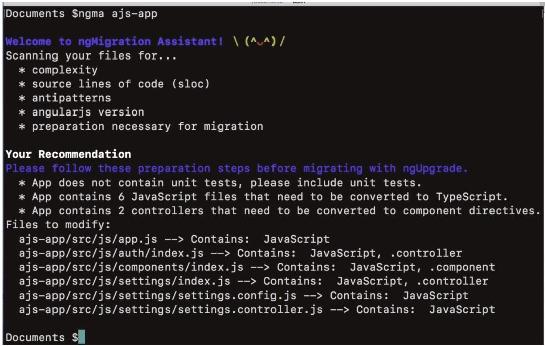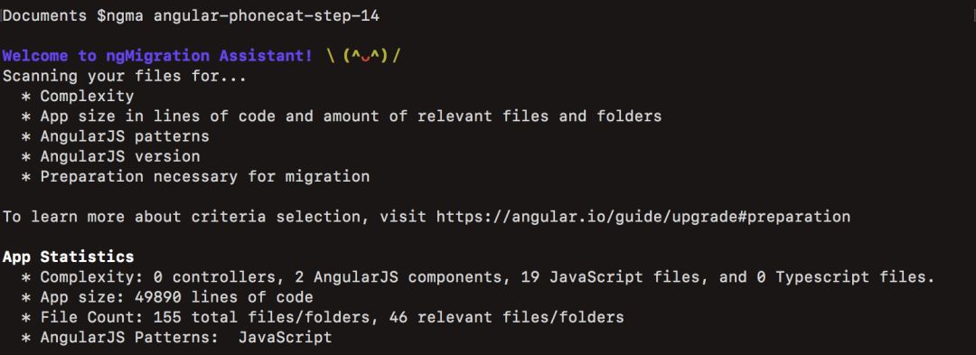 ngMigration Assistant 是一个命令行工具,用于分析 AngularJS 应用程序,并在此基础上,提出迁移路径建议。同时,它还提供应用程序中代码复杂性、大小、构造等方面的统计信息,告诉你迁移之前必要的准备工作。