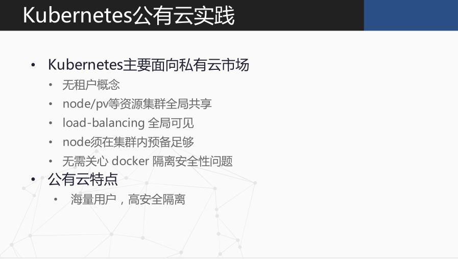 我们以前的版本是一对一的,到了新的版本后每个租户可以去创建多个 Namespace。像认证、授权、也是在租户这边安排。还有一个像 Kubernetes ,它的 Node 资源,是预分配的,你在创建集群时,就要提前把这些 Node 资源准备好,它才可以调度。但是这个场景在公有云就不合适。因为你无法预估用户需要多少资源,没办法根据这个去部署。