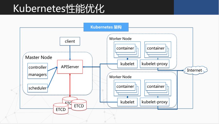 社区从 1.0 的 100 个 Node 到 1.6 的 5000 个 Node。虽然数量已经增加了很多但可能还不够。 我们是希望一个集群能做到 3 万个 Node,所以我们在这里做了很多东西。但在 Kubernetes 的架构里,它所有的请求都是通过 API Server,然后去做一些查询、访问,再到 etcd 做产品。etcd 就是一个瓶颈,而且 etcd 本身比较缺少水平扩展能力,所以需要做一些优化。